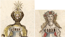 Quand la figure féminine est surmontée ou a des éléments qui remplacent ses bras, on pourrait lire dans ces représentations une esquisse "d'un cimier comportant son propre cimier".